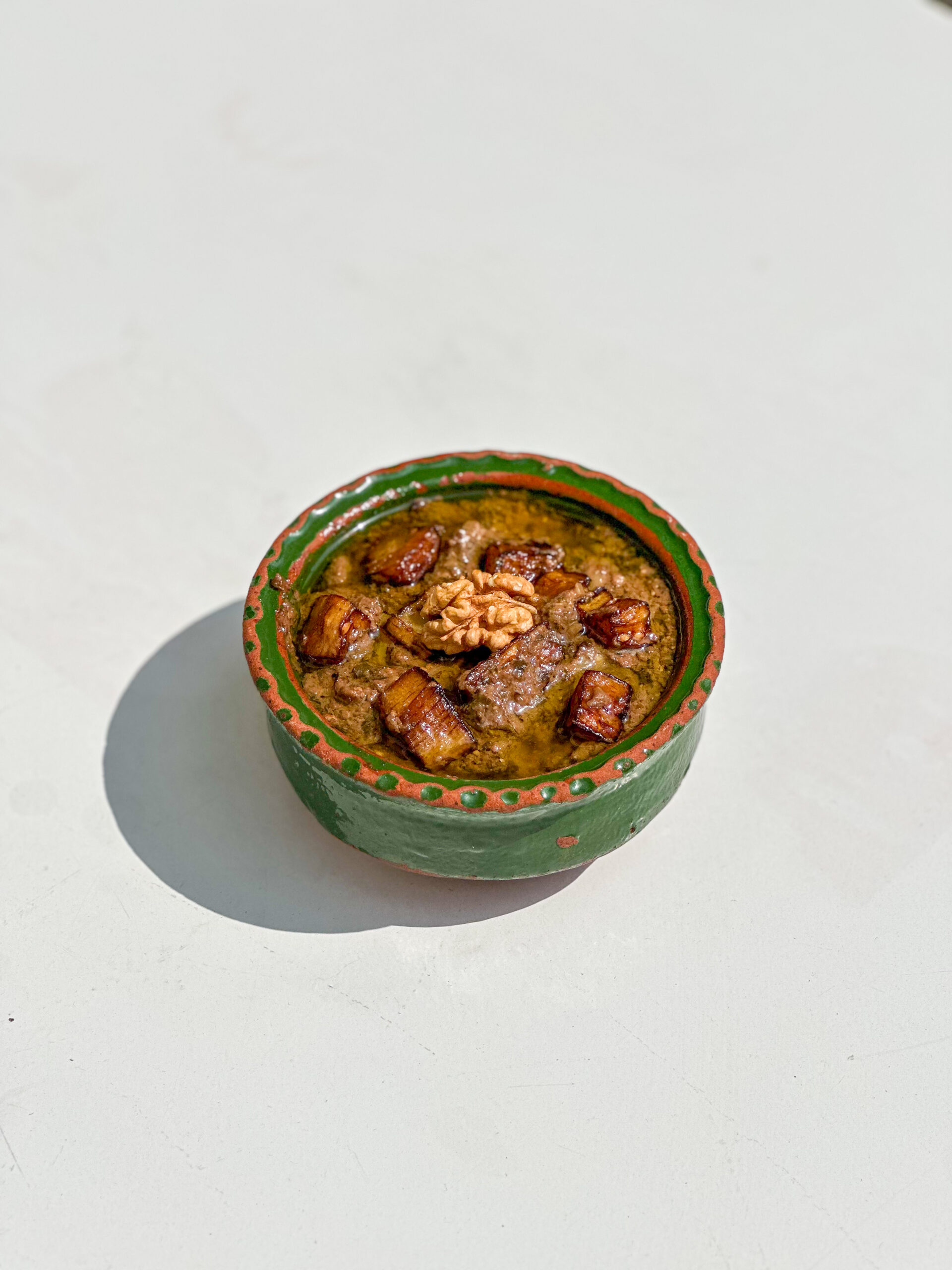 خورشت گیاهی لذیذ ترکیبی از گردو سابیده شده سبزی ویژه گیلان بادمجان نگینی و چاشنی های مخصوص